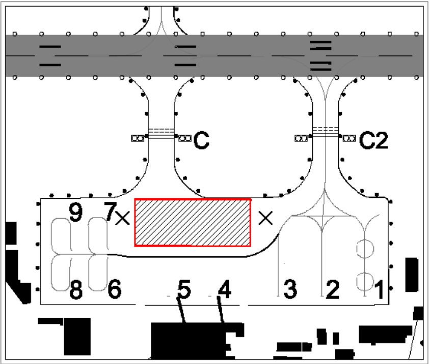 Aircraft using parking bay 6,7,8 and 9 shall follow the revised aircraft stand taxilane to TWY C2. (see reference chart)