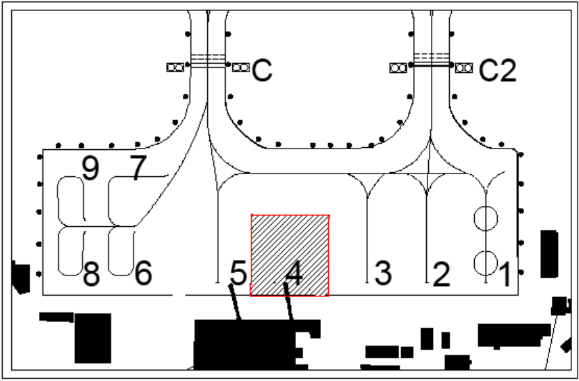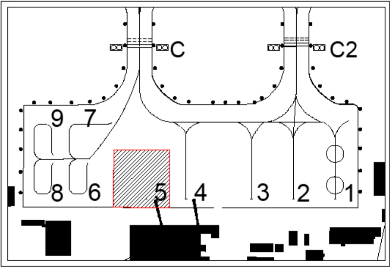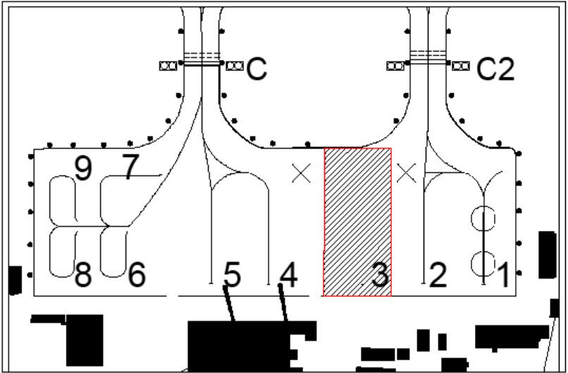 航機使用6、7、8、9 號停機位應遵循臨時停機位滑行路徑連接C2滑行道(參閱示意圖)。
