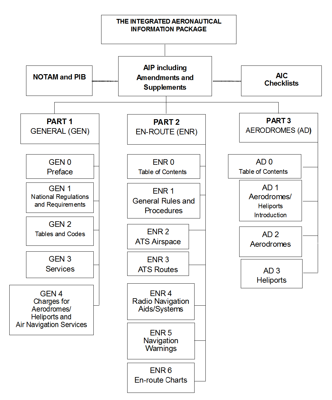 The AIP is made up of three parts. General (GEN), En-route (ENR) and Aerodromes (AD), each divided into sections and subsections as applicable, containing various types of information subjects.